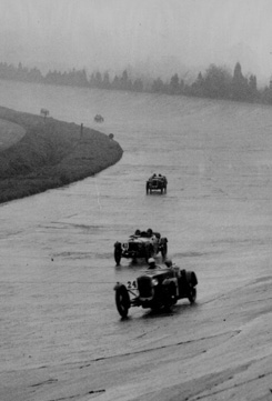 The Double Twelve Race was to take place on the 8th and 9th May, and as neither Braidwood nor I had previously driven in car races, we had to put in some qualifying laps on the Brooklands Mountain circuit. None of the team cars had been completed by the 27th April, so the Works lent us an Anzani-engined Boulogne Vitesse, which flooded it's carburettor on the way to the Track. However Braidwood contrived to win his heat. I had to concede 10 seconds to Mrs Wisdom on her blown roller bearing job, which I rather resented, but anyhow I satisfied the examiners. The Works meantime were toiling on until midnight most nights to complete the team cars, and I received mine at 4.30pm on Sunday 3rd May, and we set to work running it in. The race started at the depressing hour of 8am, on a wet track. The course was a dull one for a Frazer Nash, being clockwise round the outer circuit, which meant we were encountering the sharp side of the many bumps, a dive off the banking on to the flat at the bottom of the circuit, and then over what was almost a step, on to the Finishing Straight. The pits were already busy with mechanics repairing wing stays and other parts broken and shaken loose by the rough track. Our car was the only one in the team which had escaped so far, but we had constant trouble with breaking chains , partly due to heat from the exhaust pipe, which ran back inside the undertray, and also fuel feed stoppages. Braidwood took the first spell next morning, but after two laps came in with two big ends gone, due to a fractured oil pipe. Undaunted by this he and James removed the crankcase while a car dashed off to Isleworth to get spare rods, which were brought back and refitted. The job was completed by 1 o'clock and Braidwood then put in a lap at 84mph, "just to show that we were still in the race" as he put it. The other two cars came in for chains and we did later, and then the car caught fire when being re-fuelled. At 4.30 the oil pressure went low again, but we managed to stagger on until 5.30, when two more big-ends packed up and we retired. The car driven by D.A Aldington and Mrs Wisdom retired about the same time with engine trouble, leaving only H.J (Aldington, Car no.24/ MV 158) to continue to the end of the race. During this last few laps he ran in company with Bertelli on the leading Aston-Martin, but 558 miles behind him in the race. |
